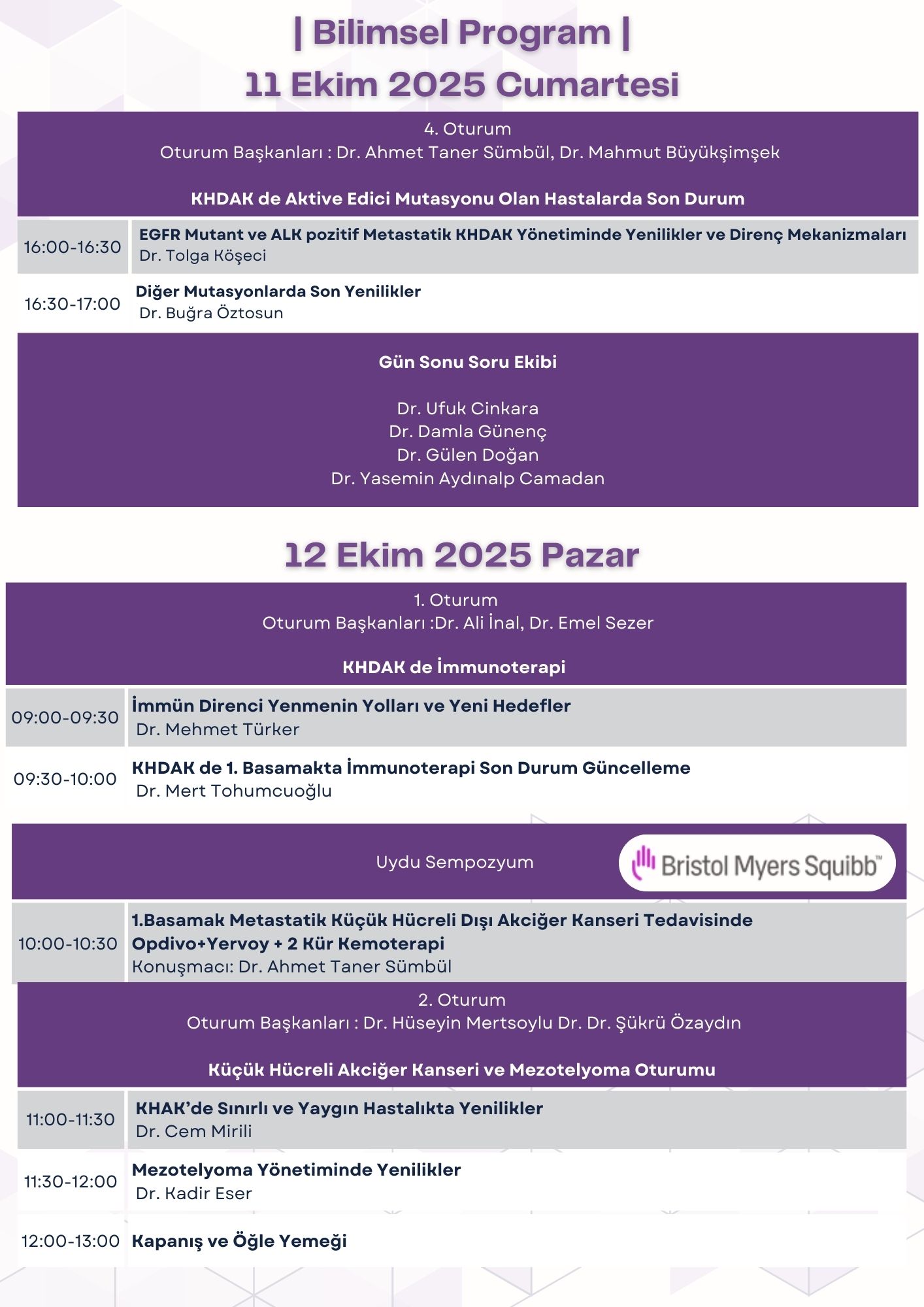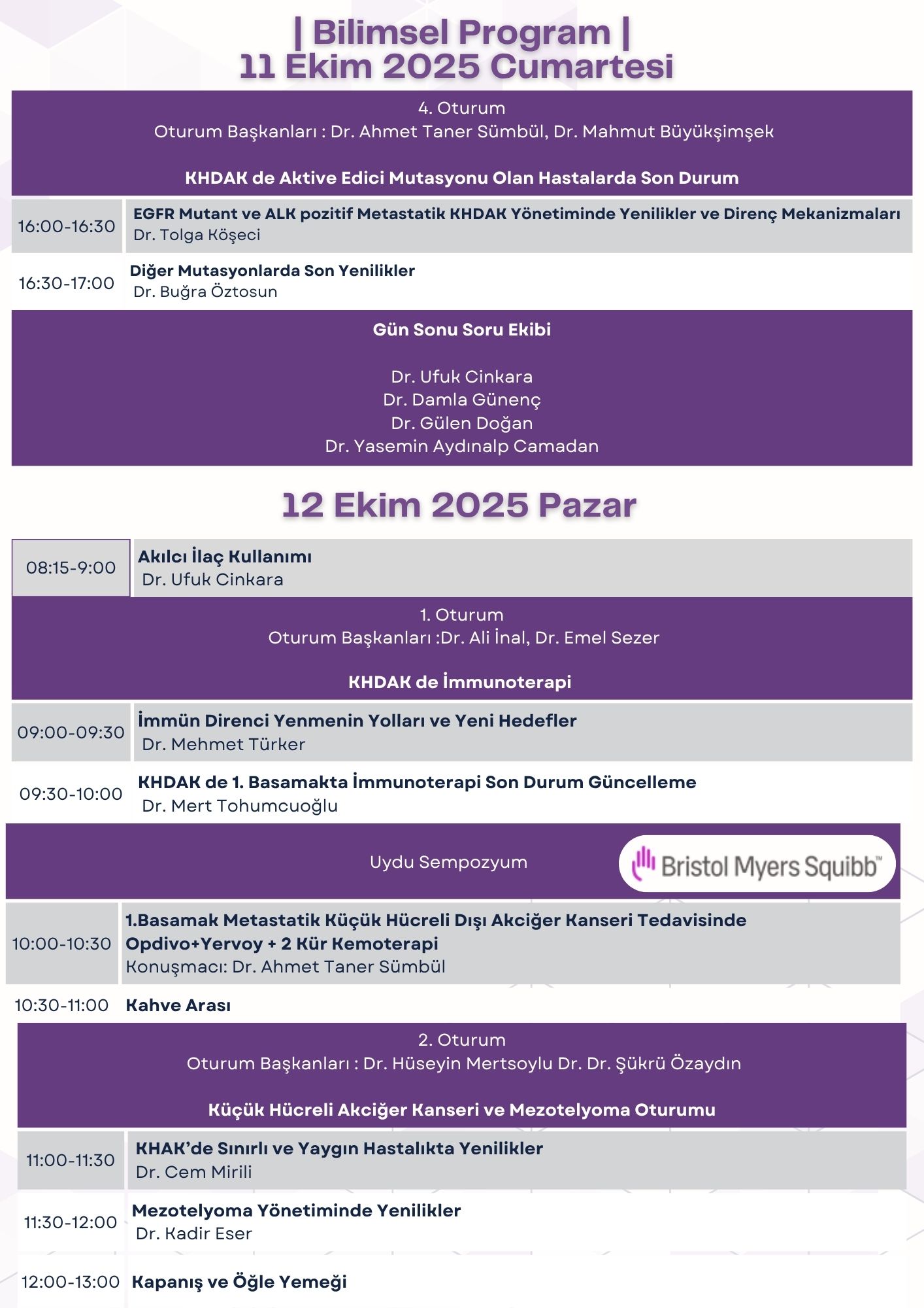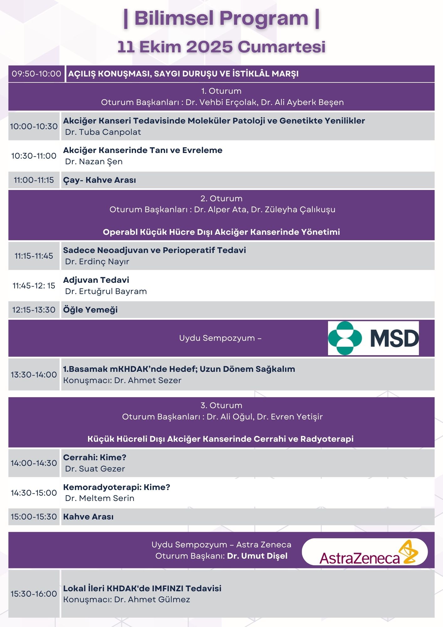 11-12 Ekim 2025 tarihinde Çukurova İç Hastalıkları Uzmanlık Derneği olarak “Akciğer Kanseri Sempozyumu” bilimsel etkinliği, Mersin Lamos Otel, Toplantı Salonu’nda yüz yüze düzenlenecektir. Bilimsel program aşağıda yayınlanmıştır.